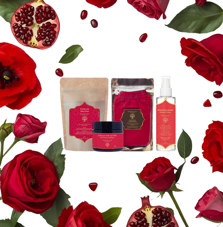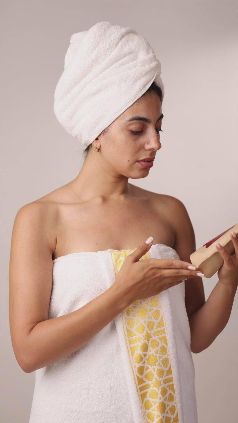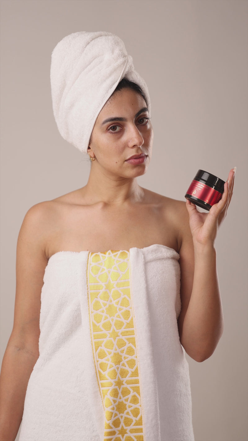 اكتشف طقوس السبا المغربية في مجموعة واحدة تم اختيارها بعناية وتضم مكونات عمرها قرون: صابون بلدي الأسود المنظف بعمق، وقناع عشبي منعش من عشبة التبريما مع عكر فاسي، وقفازات كيسا المقشرة التقليدية، وماء الورد العضوي المهدئ.